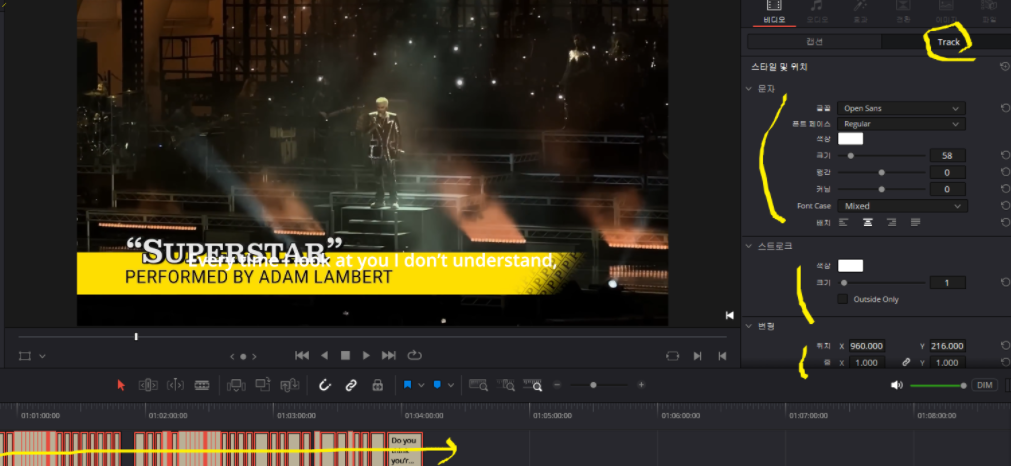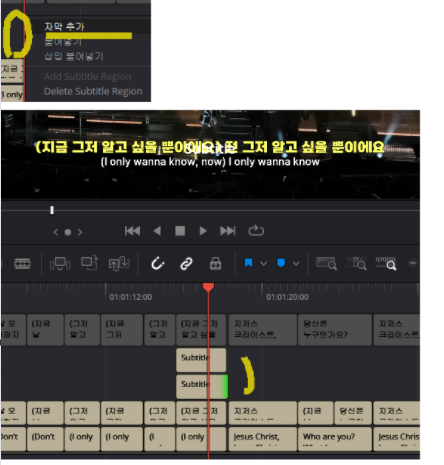 다빈치 디졸브에선 add subtitle region 으로 추가할 수 있습니다 만세!