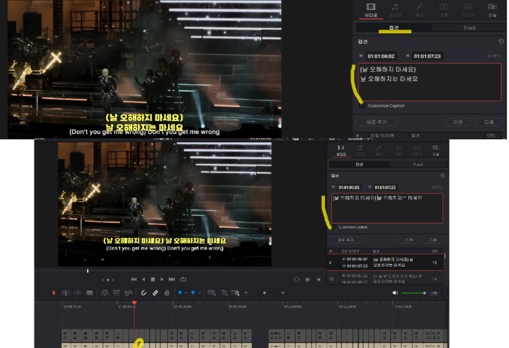 +) 자막을 삭제하면 밀려나는 현상이 있어서 자막 삭제 시 delete (x) / backspace로 하길 추천